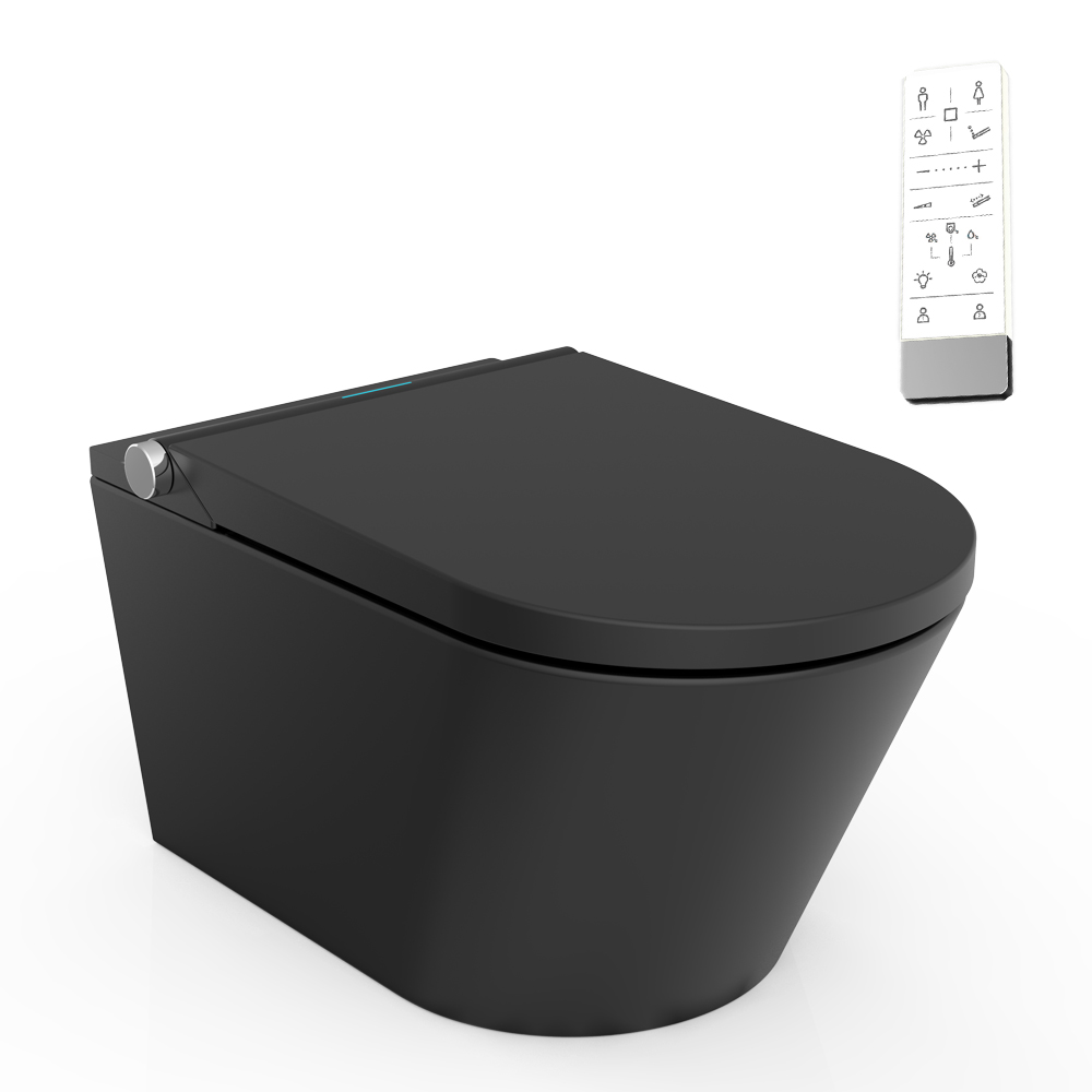 Dit slimme wandtoilet in Europese stijl combineert strak minimalisme met geavanceerde technologie. De matzwarte afwerking zorgt voor een elegante uitstraling en past perfect in moderne badkamers. Het integreert toilet- en bidetfuncties: dubbele spoeling (waterbesparend), instelbare bidetstraal (temperatuur/druk), verwarmde zitting en warmeluchtdroger. Dankzij de wandmontage bespaart het toilet ruimte en is het gemakkelijk schoon te maken. De IPX4 waterdichtheid en antibacteriële zitting garanderen veiligheid. Ideaal om uw badkamer in Europese stijl te verfraaien met comfort en stijl.
